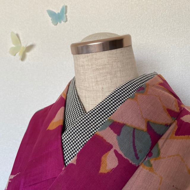【英国の代表的なデザイン × 日本の伝統文化の着物♪】 黒の「千鳥格子」柄の半襟です。 クールでスタイリッシュなコーデも、 しっとり落ち着いたコーデも、幅広くお楽しみくださいませ♪ ・ ・ ・ 「千鳥格子」はイギリスが発祥と言われる定番格子柄。 長年ロイヤルファミリーに愛され、人気ブランドのコレクションでも度々登場します。 日本では、千鳥が連なって飛ぶ姿に見えるため、こう呼ばれているとか。 こちらは小さめのパターン。 無地や柄物、どんなお着物にも合わせやすいです。 しっとりと柔らかい風合いで、春、秋、冬、におすすめです♪ 縫い付けでも、安全ピンでも取り付けやすく、お着物コーデの幅が広がります♪ 映画鑑賞や観劇やデート、お食事会、ショッピング… ちょっとしたお出かけから普段のお着物生活まで、 カジュアルシーンで幅広くお使い頂けます♪ 木綿きものやウール、紬、アンティーク、 無地、ポリエステル、洋装ミックスなど… 色々なお着物と合わせていただき、 お着物ライフをお楽しみくださいませ♪ コーディネートの帯 【★恋するイギリス半幅帯★いちご泥棒とタータンチェック】も好評販売中です♪ ◆サイズ 幅 約15センチ 長さ 約110〜113センチ ※素材の特性上多少の誤差はご了承下さいませ。 ※布端はロックミシンで処理してあります。 ※生地の耳(端)はそのまま使用しております。 ◆素材 本体: コットン100% 【♪受注生産商品です♪】 ◆ラッピング 無料ラッピング承ります♪ ご希望の方はご注文の際、オプションの選択をお願い致します! ◆お手入れ方法 ※お洗濯の際は、優しく手洗い、またはネットのご利用をおすすめ致します。(綿製品の特性上、多少の縮みがある場合がございます。) ※ 蛍光剤入りの洗剤や漂白剤、タンブラー乾燥はお避け下さい。 ※ アイロンの際は中温か、高温で当て布をし、シワを優しく伸ばして下さい。 ◆ご購入の際の注意点 ※ 本品はハンドメイド作品です。一つ一つ心を込めて丁寧にお作りしておりますが、形やサイズの多少の誤差、ゆがみ等がある場合がございます。予めご了承の上ご注文下さいませ。 ※商品によって、形やサイズに誤差がある場合がございますが、生産過程においてどうしても生じてしまう事項ですので、予めご了承の上ご注文下さいませ。 ※ 不良品以外での、ご購入者様都合の返品交換は行っておりません。注意点をお読みいただき、ご理解の上ご購入をお願い致します。 ※ 商品画像は本物に近い色を心がけて撮影しておりますが、ご覧になるモニター環境によっては、写真と実物が若干異る場合がございます。予めご了承下さい。 ※ 画像は見本です。生地の裁断個所によって柄の出方が多少変わります事をご了承下さい。 ※ その他ご質問などございましたら、お気軽にお問合せ下さいませ♪