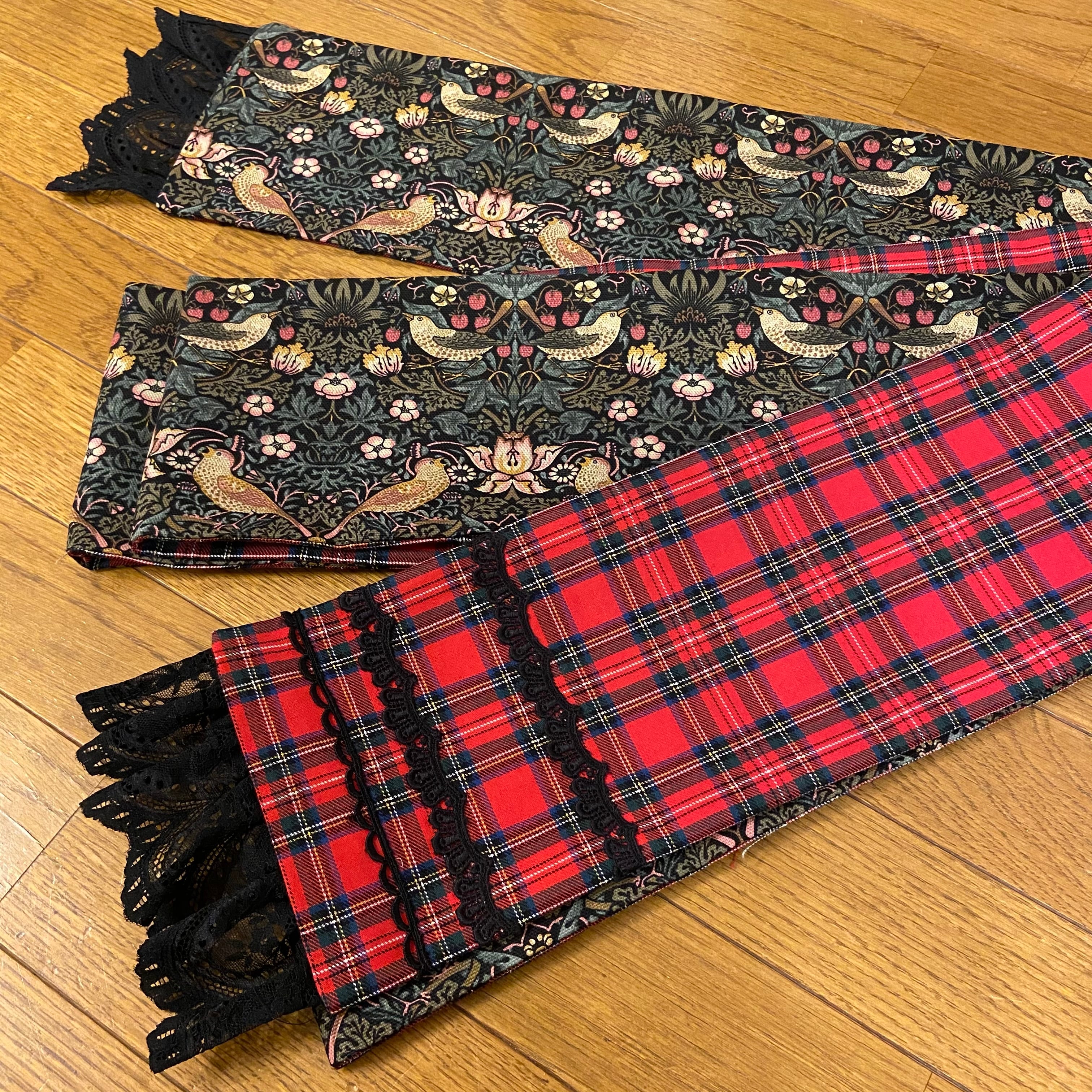 ※いちご泥棒柄は3箇所、チェック柄は2箇所継ぎ目がございます。できる限り目だだない位置で縫い合わせをし、デザインしておりますが、結び方によっては見えてしまう場合もございますのでご了承下さい。