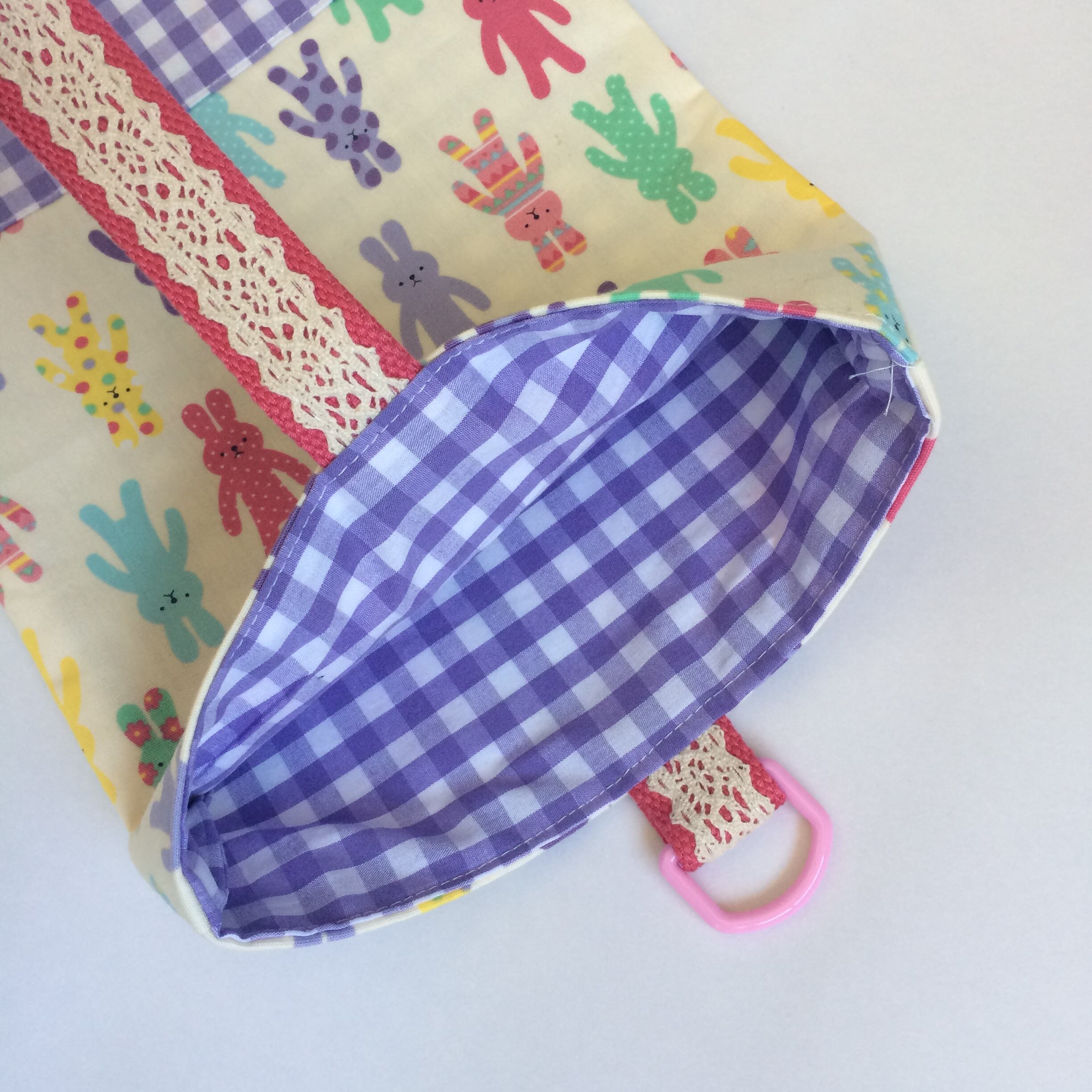 パステルカラーの可愛いうさぎさん柄に、パープルのギンガムチェックを合わせ、